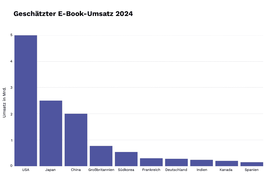 Die Grafik zeigt, welche zehn Länder den globalen E-Book‑Markt anführen. Besonders deutlich wird, wie stark der englischsprachige Raum den globalen E-Book‑Markt prägt: Die USA allein erzielten 2024 rund 5,3 Mrd. USD Umsatz. Direkt dahinter folgen wichtige asiatische Märkte. Europa fällt im Vergleich etwas kleiner aus, bleibt aber durch seine Vielfalt und stabile Leserschaft ein relevanter Player. Die Daten machen deutlich, dass digitales Lesen weltweit fest etabliert ist – mit regional unterschiedlichen Dynamiken.