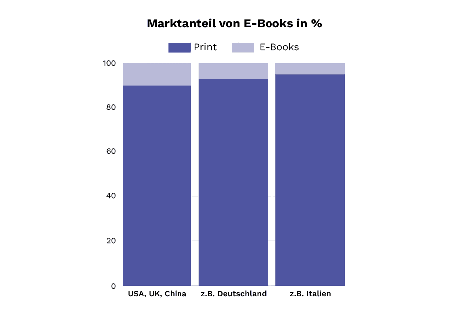 Auch wenn Print weiterhin im Gesamtmarkt dominiert, wächst der Anteil der E-Book‑Leserschaft weltweit kontinuierlich. Vor allem die USA, Großbritannien und China liegen hier mit rund 10 % weit vorne. Deutschland bewegt sich im soliden Mittelfeld.