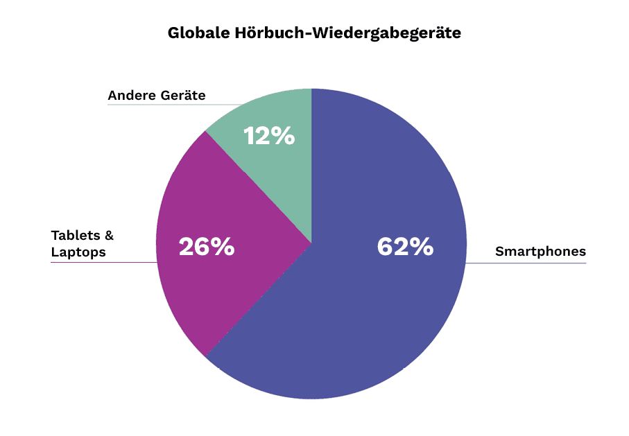 Smartphones sind weltweit das wichtigste Gerät für das Hören von Hörbüchern. Tablets und Laptops liegen knapp dahinter. Andere Geräte wie Smart Speaker, Wearables und In‑Car‑Systeme spielen aktuell eine kleinere Rolle.