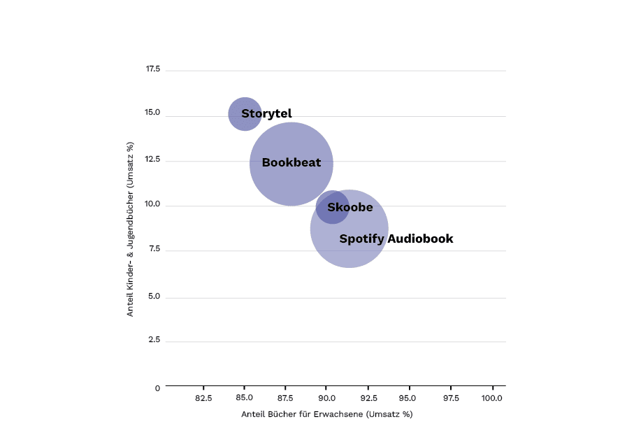 Auch bei Kampagnen, die jenseits von Preisstrategien angesiedelt sind, sind die markt- und plattformspezifischen Daten zentral für den Erfolg. Hierzu wiederum ein Beispiel: Ein Verlag möchte eine neue Jugendbuch-Serie (Hörbuch) mithilfe von Facebook-Ads bewerben. Die Anzeigen enthalten einen Link auf den ersten Titel der Serie in einer Streaming-Plattform. Damit stellt sich die Frage: Auf welche Plattform soll der Link verweisen? Da nicht alle Plattformen demographische Daten liefern, kann die “Jugendbuch-Affinität” höchstens geschätzt werden, und zwar auf Basis der Umsatz- oder Streaming-Anteile, die Titel aus den Genres “Kinder- und Jugendbuch” haben. Hier ergibt sich z.B. für ausgewählte Streaming-Anbieter im deutschsprachigen Markt: