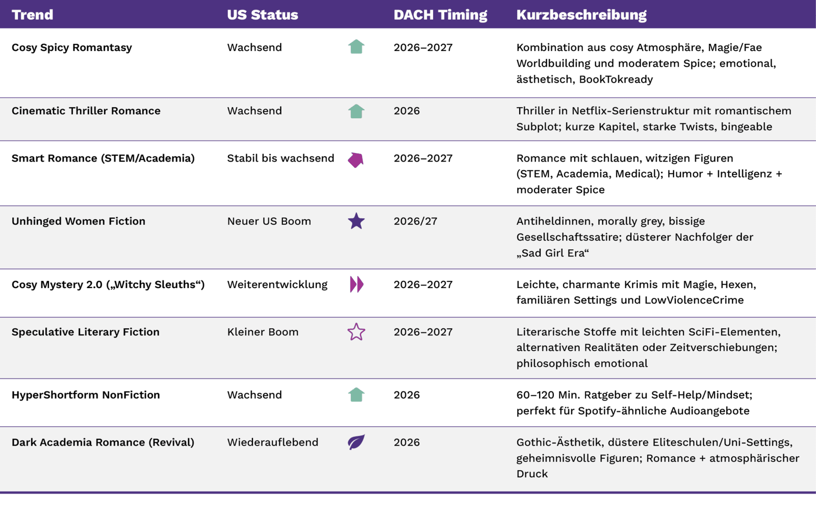 Auf Basis der aktuellen Trends im US-Markt lässt sich vermuten, dass im aktuellen und kommenden Jahr folgende Genre-Trends im DACH-Markt an Relevanz gewinnen werden: