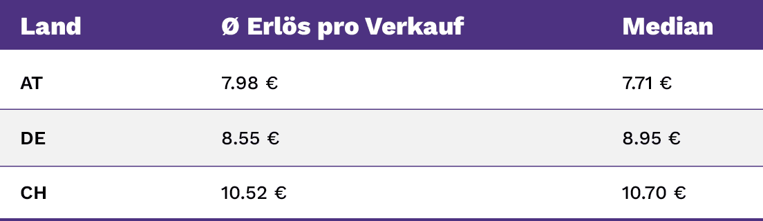 Österreich liegt damit deutlich unter dem deutschen Niveau (ca. -6,7 %). Der Median – also der Wert, der alle erzielten Verkaufspreise in zwei gleichgroße Mengen aufteilt – liegt sogar 1,24 € unter dem Median in DE (-13,9 %). Das bedeutet, dass 50 % der Verkäufe in AT unter 7,71 € liegen. Normalerweise sollte AT aber gleichauf oder leicht über DE liegen, weil AT und DE eine ähnliche Kaufkraft aufweisen (mit leichten Vorteilen für AT).