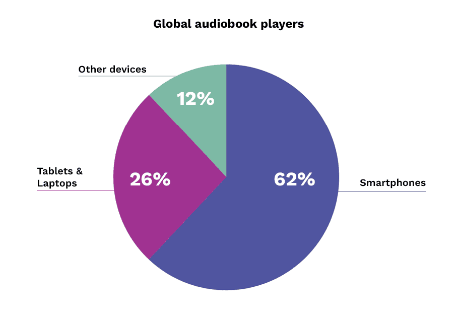 Smartphones are the most important device for listening to audiobooks worldwide. Tablets and laptops are close behind. Other devices such as smart speakers, wearables, and in-car systems currently play a smaller role.