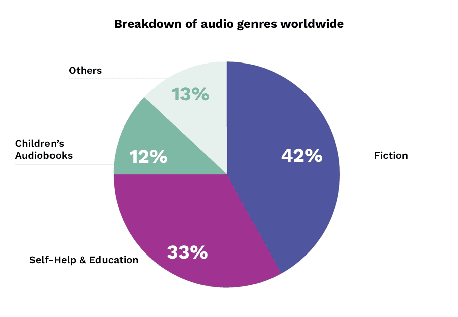 Fiction is clearly the most popular audio genre worldwide and attracts the largest audience. It is followed by self-help, educational, and children's audiobooks. The genre distribution shows that listening habits may differ internationally, but certain content works particularly well across country and language boundaries.