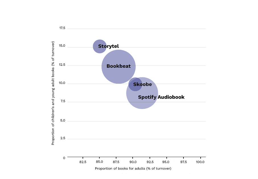 Market- and platform-specific data is also key to the success of campaigns that go beyond pricing strategies. Here is another example: A publisher wants to promote a new series of young adult books (audiobooks) using Facebook ads. The ads contain a link to the first title in the series on a streaming platform. This raises the question: Which platform should the link refer to? Since not all platforms provide demographic data, the "young adult book affinity" can only be estimated at best, based on the sales or streaming shares of titles in the "children's and young adult books" genres. For selected streaming providers in the German-speaking market, for example, this results in the following: